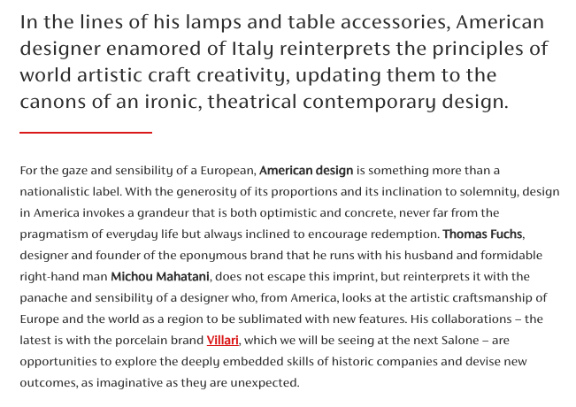 "American designer enamored of Italy reinterprets the principles of world artistic craft creativity, updating them to the canons of an ironic, theatrical contemporary design..."