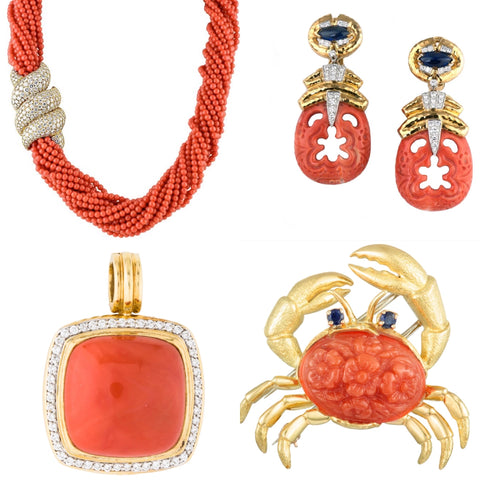 Top left clockwise: Harry Wintson Coral Necklace, David Webb Coral Earrings, David Yurman Coral Pendant, Tiffany & CO. Coral Crab Brooch